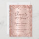 Feiern Sie stilvoll mit diesem modernen Rose Gold Glitzer "Cheers to 90 Years" Geburtstagseinladung. Dieses elegante und feminine Design besticht durch glänzende Details in der Rose mit vergoldeten Glitzer, eine anmutige Swash Schwanz Kalligraphie-Skript und einen sanften, rot-rosa metallischen Hintergrund. Ideal für eine glamouröse Geburtstagsparty des 90. Geburtstags oder ein Meilenstein - leicht anpassbar für eine 40., 50., 60., 70. oder sogar 80. Geburtstagsfeier.