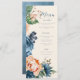 Une floraison de roses brillants et audacieux dans les tons bleu poussiéreux et pêche est le point de convergence de nombreuses pièces de cette suite mariage qui dispose également d'élégants textes de script et des dispositions de design moderne. Le menu mariage présenté ici a une bordure latérale de roses et une belle aquarelle abstraite au verso en bleu poussiéreux. Entrez facilement les détails de votre menu personnel, la date du mariage et les initiales de la mariée et du marié à l'aide du modèle fourni. Cherchez ID584 pour voir toutes les pièces correspondantes dans ce bel ensemble de mariages.