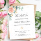 Ein schick weißer Hintergrund. Dekoriert mit einer Rose Gold und rot rosa Blumen, Rose Blume und grüne Aquarell Eukalyptus Blätter, Sprigs, Grün und ein Imitat goldbraun. Personalisieren und fügen Sie Ihre Namen und die Details. Schwarz-Grün-Buchstaben. 1 Blatt = 1 Einladung mit Druckkante bis Kante.