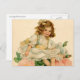 Dieses Vintage-Bild zeigt ein junges Mädchen, das auf einem Strauß mit hübschen, rosa Rosen sitzt.