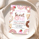 Pink Brown Sweet One Donut Invitation Anniversaire Gâteaux ou beignes sur le thème de l'invitation de premier anniversaire avec divers beignets et quelques cupcakes principalement en rose et marron. Cette douce invitation d'un anniversaire est idéale pour un beignet ou sucré thème de premier anniversaire pour une petite fille.