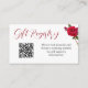 Eintrittskarten zum Hochzeitskartentor. Direkt auf einer Hochzeitswebsite, um die Geschenkgutscheine zu finden, indem man diese kleinen Karten mit dem QR-Code anpassen kann. Weiße Karten haben oben ein rotes Skript, einen kurzen Absatz und eine QR-Code-Vorlage. Eine Rose mit Blüte und Knospen schmückt die obere rechte Ecke. Die Rückseite ist solide rot. Umschließen Sie eine Karte mit einer Einladung zu einer Dusche, einem Verlobungsfest oder einer Hochzeitsfeier und einem Empfang.