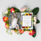 Das Design besticht durch elegante Sonnenblumen, Rose und Wildblumen mit einer goldgelben, roten und grauen Farbpalette. Das Design zeichnet sich auch durch einen kohlegrauen Rahmen vor einem rustikalen Holzhintergrund aus. Bildvorlage über Pixabay, lizenziert unter CC0 und muss durch Ihr eigenes Foto ersetzt werden