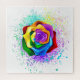 Große, blühende Rose mit Regenbogenblüten auf weißem Hintergrund, überstrichen mit farbenfrohen, hellen Farbtupfern. 3d