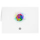 Große, blühende Rose mit Regenbogenblüten auf weißem Hintergrund, überstrichen mit farbenfrohen, hellen Farbtupfern. 3d