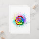 Große, blühende Rose mit Regenbogenblüten auf weißem Hintergrund, überstrichen mit farbenfrohen, hellen Farbtupfern. 3d