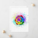 Große, blühende Rose mit Regenbogenblüten auf weißem Hintergrund, überstrichen mit farbenfrohen, hellen Farbtupfern. 3d