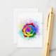 Große, blühende Rose mit Regenbogenblüten auf weißem Hintergrund, überstrichen mit farbenfrohen, hellen Farbtupfern. 3d