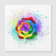 Große, blühende Rose mit Regenbogenblüten auf weißem Hintergrund, überstrichen mit farbenfrohen, hellen Farbtupfern. 3d