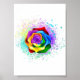 Große, blühende Rose mit Regenbogenblüten auf weißem Hintergrund, überstrichen mit farbenfrohen, hellen Farbtupfern. 3d
