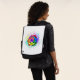 Große, blühende Rose mit Regenbogenblüten auf weißem Hintergrund, überstrichen mit farbenfrohen, hellen Farbtupfern. 3d