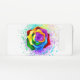 Große, blühende Rose mit Regenbogenblüten auf weißem Hintergrund, überstrichen mit farbenfrohen, hellen Farbtupfern. 3d