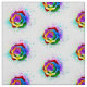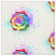 Große, blühende Rose mit Regenbogenblüten auf weißem Hintergrund, überstrichen mit farbenfrohen, hellen Farbtupfern. 3d