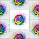 Große, blühende Rose mit Regenbogenblüten auf weißem Hintergrund, überstrichen mit farbenfrohen, hellen Farbtupfern. 3d