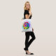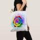 Große, blühende Rose mit Regenbogenblüten auf weißem Hintergrund, überstrichen mit farbenfrohen, hellen Farbtupfern. 3d