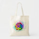 Große, blühende Rose mit Regenbogenblüten auf weißem Hintergrund, überstrichen mit farbenfrohen, hellen Farbtupfern. 3d