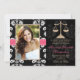 Ajoutez votre image de photo ou de favori à ces annonces et invitations florales noires et blanches élégantes et formelles d'obtention du diplôme d'école de droit de damassé avec des échelles d'un or de conception de justice et de conception imprimée de regard de ruban piquée par roses indien fuchsia. Customisez-le pour dire celui que vous vouliez sur l'arrière et avant des annonces et des invitations d'obtention du diplôme de diplômé d'avocat. © Chrissy H. Studios, LLC d'illustration. Tous droits réservés.