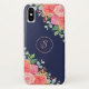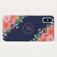 Dieses Handy-Gehäuse zeichnet sich durch ein modernes Aquarell-Blumendesign mit rosa und korallenfarbenen Blume, Blattwerk, Imitat Rose Gold Glitzer und Monogramm auf einem marineblauen Hintergrund aus. Personalisieren Sie es mit einem ersten.