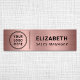 Modernes berufliches Namensschild mit Ihrem Firmenlogo vor einer gebürsteten Rose Gold Imitate Metall Hintergrund. Fügen Sie einen Namen und Titel in einfachem Text hinzu.