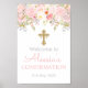 Das ist das perfekte Begrüßungspposter für Ihre kleinen Mädchen Taufe, Taufen, Bestätigung oder Kommunion. Die Einrichtung besteht aus einem vergoldeten Imitat-Kreuz mit Glitzer und einfachen rosa Rosen. Günstig zu nutzen, um die Gäste zu empfangen, entweder gerahmt oder Set an einer Wand.