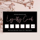 Chic Loyalitätskarte mit modernem Skript-Schriftart, Rose Gold Effekte und schwarzer Hintergrund. Sie können Ihre Firmendetails und Ihr Logo hinzufügen, um diese Kundenkarte zu Ihrem eigenen Design zu machen. Diese berufliche Lochkarte enthält 6 Rose Gold Briefmarke Slots oder Sie können mehr hinzufügen, wenn Sie möchten. Mit diesem trendig rosa goldfarbenen und schwarzen, loylattigen Kartenvorlage können Sie elegante Lash-, Braun- oder Nägel-Lochkarten erstellen.