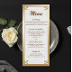 Ein elegantes und modernes Hochzeitsmenü mit einem vergoldeten Rahmen aus der Rose und einem Leinenlook-Center mit goldenen Blumenelementen an den Ecken und einem großen Goldelement auf der Rückseite, um Ihrer Hochzeit oder einem anderen besondere Anlass eine Touch von Eleganz und Stil hinzuzufügen. Alle Menüoptionen können vollständig an den Anzug angepasst werden. Löschen Sie einfach, was da ist, und fügen Sie Ihre eigenen Daten hinzu.
