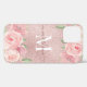 Stilvoll, gürlich iPhone 12 Gehäuse mit Aquarell rot Rosa Blumen und grüne Rahmen mit Imitats Rose Gold Glitzer Hintergrund. Fügen Sie den Vorlagen ein benutzerdefiniertes Monogramm und einen Namen hinzu, um ein einzigartiges und personalisiertes Geschenk zu erstellen. ©Sweetwhimsypaperie