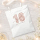 Feiern Sie einen besonderen Sweet 16 mit dieser eleganten Rose Gold Glitzer Drehbuch Geburtstag Gunst Tasche. Dieses Gastgeschenk mit einem kühnen Glitzer "16"-Design mit einem individuellen Namen in einem stilvollen Drehbuch, ist ideal, um den Gästen ein besonderes Dankeschön zu geben. Diese trendige Begehrensasche ist ein unvergessliches Statement für die Geburtstagsfeier des Mädchens.