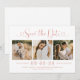 Moderne Rose Gold und Weiß Hochzeit speichern die Datumskarten mit einer Collage von drei quadratischen Verlobungen Fotos und ein stilvolles typografisches Design mit schicken Kalligraphie-Skript und einem Herzinfarkt. Der einfache und elegante, kundenspezifische Text, der mit dem numerischen Hochzeitstermin, den Braut- und Bräutigam-Namen, der Zeremonie-Position, der Hochzeitswebsite und der formellen Einladung zum Nachfassen von Formulierungen vollständig personalisiert werden kann.