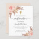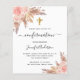 Ein schick weißer Hintergrund. Die Einrichtung besteht aus Rose-Gold und Rosa-Blumen, Rose, Pampas-Gras und einem goldenen Kreuz. Personalisieren und fügen Sie einen Namen und Details.