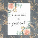 Ein weißer Hintergrund mit Rose goldfarbenen Rose Blumen, Blume und Eukalyptusgrün. Mit dem Text: Bitte unterschreiben Sie das Gästebuch.