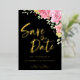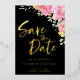 Moderne Folie Aquarell rosa Rosenecke auf schwarzem Hintergrund mit goldfarbenem handgeschriebenem Schriftart "Save the Date" Einladung. Dieses Design verfügt über einen großen kalligraphischen Schriftart, den Sie ändern können. Sie können auch alle Details und Farben auf diesem Save the Date Design anpassen.