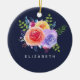 Personalisiertes Ornament mit einem hübschen Bouquet von Aquarellfarben-Rose mit Ziern, Blätter und Ästen, die alle in einer farbenfrohen Blumenstruktur zusammengesetzt sind. Navy Hintergrund.