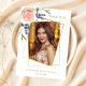 Ein modernes und elegantes Brautparty Foto danke Ihnen Karte. Ein schick weißer Hintergrund. Die Einrichtung ist mit einer Rose in Gold und Rosen in Rosa, Blumen, Blume und Lavendel dekoriert. Auf der Vorderseite den Text: Danke, Name und ein Datum. Zurück: Vorlage für Ihren Dank Notiz und Name.