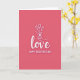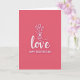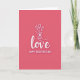 This Valentine's Day card features a rich rose-pink background that sets a romantic mood right away ❤️. Centered on the front, the word “love” appears in smooth white lettering with a faint shadow that makes it stand out. Above the lettering, a simple line drawing shows a hand gently holding three tulips, as if offering them to someone special 🥰. The tulip petals are lightly outlined and slightly open, adding a soft, tender touch to the scene. The hand and flowers are drawn in one continuous-looking line, giving the design a modern, minimal feel. Near the bottom, “HAPPY VALENTINE’S DAY” is placed in all caps in white, using a neat sans-serif style that keeps it easy to read. The layout feels balanced, with the bouquet hovering over the main word and the greeting grounding the design. The tulips sit just above the center, their thin white lines crisp against the rose-pink field.