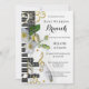 Post oder nach der Hochzeit Brunch oder Mittagessen Party Einladung mit einem musikalischen Thema Design mit einer Gitarre, Klaviertasten und musikalischen Noten in Gold und schönen frischen Rosen.