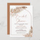 Rose Pampas Grass Arch Terracotta Boho Floral Einladung Imitate Rose Gold moderne Kalligrafie Braudusche Einladung in einem böhmischen Stil mit zwei schönen Blumenarrangements mit Pampas Gras in natürlichen und Terrakottatönen und ein Terrakotta Bogen.
