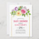 Wasserfarbenrosa Bouquet Frühling und Sommer rosa Blumenmädchen Baby Dusche Einladung. Es zeigt einen wunderschönen Bouquet mit rosa, gelben und lavendelfarbenen Rose und Blätter und einen goldenen Rahmen mit Folie. Die Rückseite ist massiv rosa.