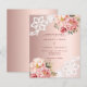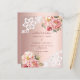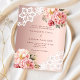 Für eine elegante und romantische Hochzeit. Rosengoldener Hintergrund mit rosa und rosa Goldfloralen, Rosen und Spitzen. Personalisieren Sie Ihre Namen und Details und fügen Sie diese hinzu. 1 Blatt = 1 Einladung mit Druckkante bis Kante.