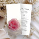 Donnez à vos invités mariages la chronologie et l'ordre de votre cérémonie de mariage dans le jardin avec le joli programme de mariage personnalisé rose sur blanc. Cet élégant programme de mariage fleuri personnalisé comprend une photo florale d'une fleur de rose rose avec un voile de mariée blanc.