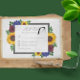Das Design besticht durch elegante Sonnenblumen, Rose und Wildblumen mit einer goldgelben, bordeauxfarbenen und blauen Farbpalette. Das Design verfügt auch über einen kohlegrauen Rahmen. Sie können die Hintergrundfarbe auf der Vorderseite und zurück in die gewünschte Farbe ändern oder beide Set in Weiß verlassen werden.