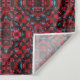 Ein komplexes, symmetrisches Muster bedeckt den gesamten Raum mit komplexen geometrischen roten und blauen Formen. Das sich wiederholende Design erzeugt einen faszinierenden, kaleidoskopischen visuellen Effekt.