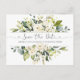 Cette conception présente une illustration de roses blanches avec un feuillage coloré et éclatant en aquarelle. Le texte "Enregistrer la date" est écrit dans une police Script avec coeurs joints.