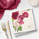 A bright, bold floral of roses in shades of burgundy and cream is the focal point for many of the pieces of this wedding suite that also features elegant script text and modern design layouts. The wedding paper napkin shown here has a corner border of roses. Easily enter your wedding date and bride and groom's initials using the provided template. Search ID584 to see all the matching pieces in this beautiful wedding set.