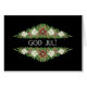 Une carte de Noël avec des butins des roses de Noël rouge et blanc, un houx et un lierre chics et floraux sur un arrière - plan noir et la salutation norvégienne de langue "Dieu juillet" dans le lettrage élégant et moderne, dans le blanc. D'une conception peinte à la main de Judy Adamson. Sentez-vous svp libre pour ajouter vos propres texte d'intérieur.