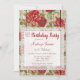 Une charmante invitation à l'anniversaire rustique avec des roses de mauvaise qualité sur un arrière - plan en bois avec cadre en dentelle blanche. Parfait pour les anniversaires jalons tels que 18ème 20ème 21ème 30ème 35ème 45ème 55ème 55ème 60ème 65ème 70ème 75ème 80ème 85ème 90ème 95ème et 100 ...ou n'importe quel âge !