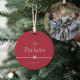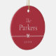 Der süße und einfache Weihnachtsschmuck ist minimalistisch gestaltet, mit Ihrem Familiennamen und dem Jahr in sauberer, klassischer Serifenschrift auf festlichem rotem Hintergrund. Ein kleiner Bogen durch die Mitte vervollständigt das Design. Fügen Sie der Rückseite ein Foto hinzu.