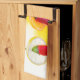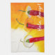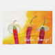 Stillleben von drei Paprikaschoten aus rotem Chili mit einem Wandschrank aus Zitronen und Tangerin vor dem strukturierten Hintergrund eines warmen und sonnigen mexikanischen Tages. geschirrtuch. Das Thema Freundschaft ist lustig. Sie können den Vorlagentext Hola, Amigo ändern oder löschen!