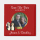 Niedliche maßgeschneiderte Save the Date Hochzeitsmagnet, mit einem roten Hintergrund, mit einem goldgekrönten runden Foto Feld gemacht. Ein hübsches Landkunstwerk Pinguin Braut und Bräutigam schmücken den Boden. Personalisieren Sie diesen hübschen Magneten, um Ihre Hochzeitsvorstellungen zu verkünden.