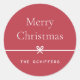 Lassen Sie Ihre Urlaubsbriefe und -geschenke mit diesen süßen und einfachen Weihnachtsaufklebern abschließen, die mit Ihrem bevorzugten Urlaubssegment und der Familiensignatur (mit "Frohe Weihnachten" gezeigt) auf rotem Hintergrund angepasst werden können. Ein kleiner Bogen, der durch das Zentrum läuft, vervollständigt dieses elegante minimalistische Urlaubsdesign.
